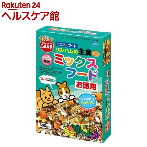 ミニマルランドのミックスフードでペレットやヒマワリ、とうもろこしやアーモンドなどたくさんの種類の種子がバランスよく配合されています。
